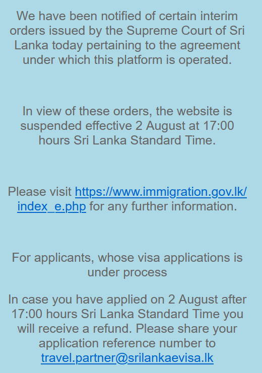 நேற்று வெள்ளி இலங்கை நீதிமன்றம் வழங்கிய கட்டளைக்கு அமைய இலங்கைக்கான விசா (e-visa) வழங்கல் பணிகளை செய்யும் பொறுப்பு இந்திய நிறுவனமான VFS Global இடம் இருந்து பறித்து மீண்டும் பழைய இலங்கை தொலைத்தொடர்பு நிறுவனத்திடம் வழங்கப்பட்டுள்ளது.