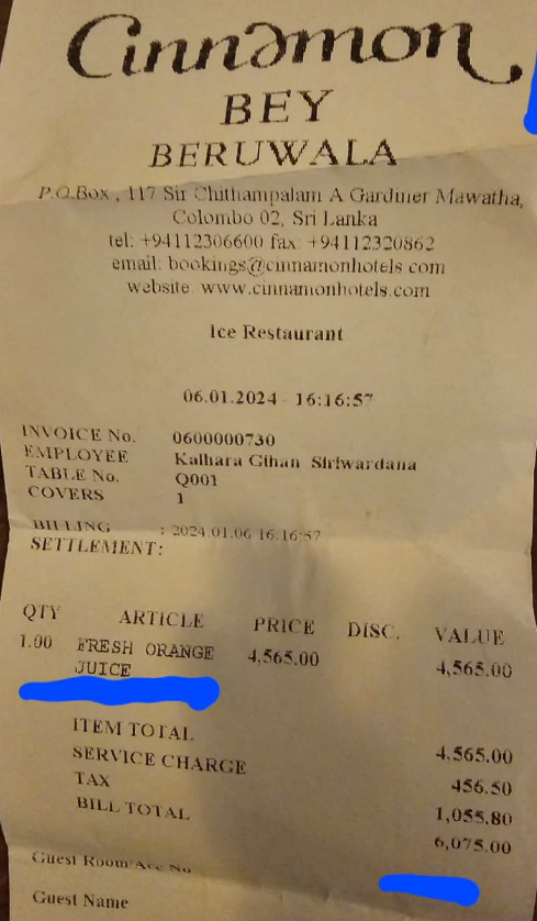 இலங்கையின் பேருவளை பகுதியில் உள்ள Cinnamon BEY என்ற உல்லாச பயணிகள் விடுதி ஒன்று orange juice க்கு மொத்தம் Rs. 6,075.00 அறவிட்டு உள்ளது.