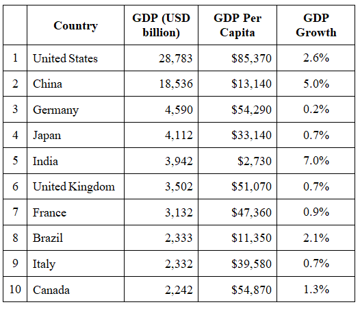 அமெரிக்காவின் Forbes செய்தி நிறுவனம் ஆண்டுதோறும் தயாரிக்கும் GDP பட்டியலில் முதல் 10 பெரிய GDP (Gross Domestic Product) நாடுகள், அந்த நாடுகளின் மொத்த GDP, தனிநபர் GDP, முன்னைய ஆண்டிலிருந்தான GDP வளர்ச்சி ஆகியன வருமாறு: