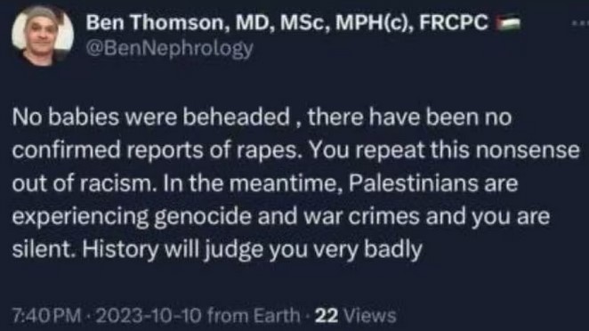 Dr. Ben Thomson என்பவரை கனடாவின் Toronto நகரை அண்டிய Richmond Hill பகுதியில் உள்ள Mackenzie Richmond Hill Hospital பதவியில் இருந்து நீக்கியுள்ளது. காரணம் இவர் தனது Twitter/X பதிவில் ஹமாஸின் தாக்குதலின் போது “No babies were beheaded, there have been no confirmed rape” என்றும் “Palestinians are experiencing genocide and war crime” என்றும் அக்டோபர் 10ம் திகதி கூறியமையே.